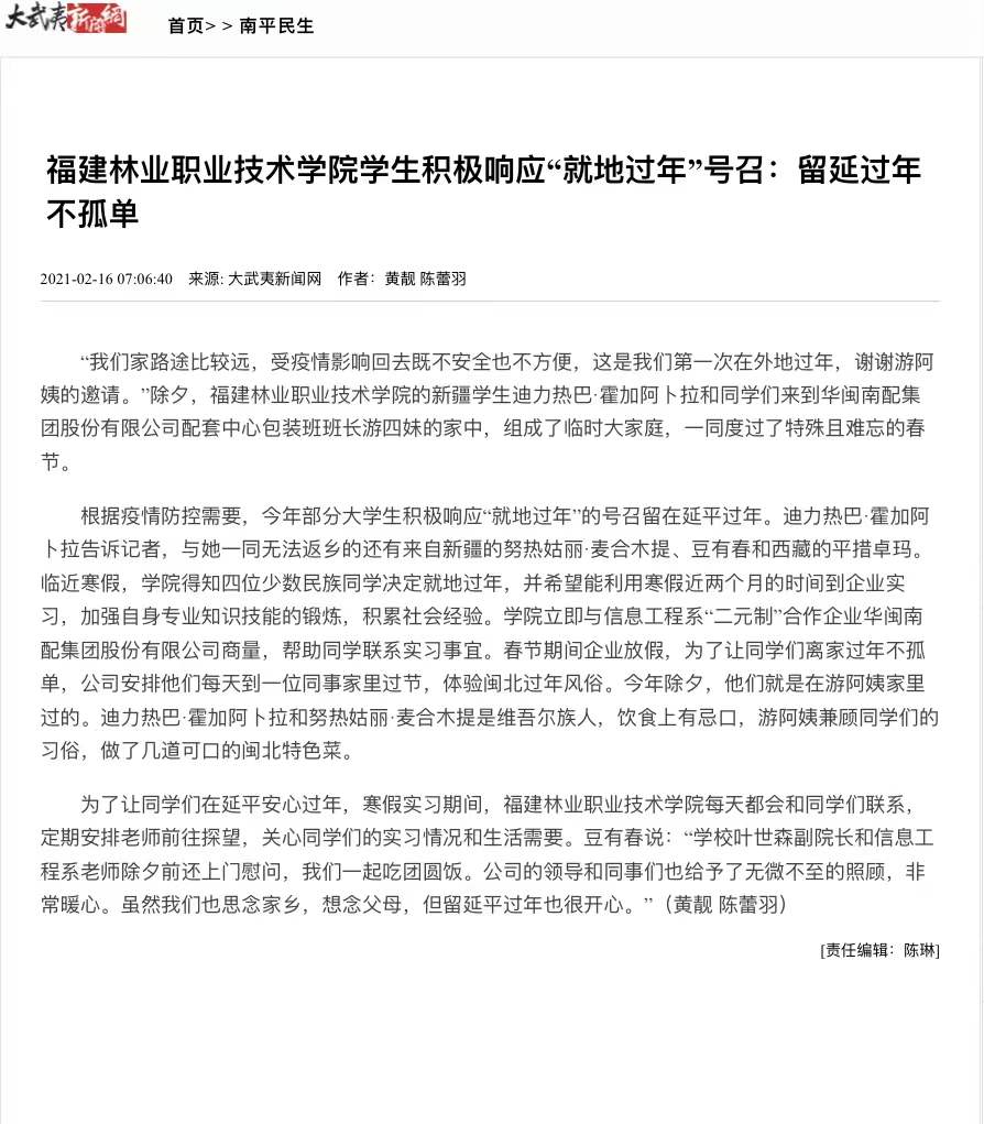 根据疫情防控需要,今年部分大学生积极响应“就地过年”的号召留在延平过年。迪力热巴·霍加阿卜拉告诉记者,与她一同无法返乡的还有来自新疆的努热姑丽·麦合木提、豆有春和西藏的平措卓玛。临近寒假,学院得知四位少数民族同学决定就地过年,并希望能利用寒假近两个月的时间到企业实习,加强自身专业知识技能的锻炼,积累社会经验。学院立即与信息工程系“二元制”合作企业华闽南配集团股份有限公司商量,帮助同学联系实习事宜。春节期间企业放假,为了让同学们离家过年不孤单,公司安排他们每天到一位同事家里过节,体验闽北过年风俗。今年除夕,他们就是在游阿姨家里过的。迪力热巴·霍加阿卜拉和努热姑丽·麦合木提是维吾尔族人,饮食上有忌口,游阿姨兼顾同学们的习俗,做了几道可口的闽北特色菜。