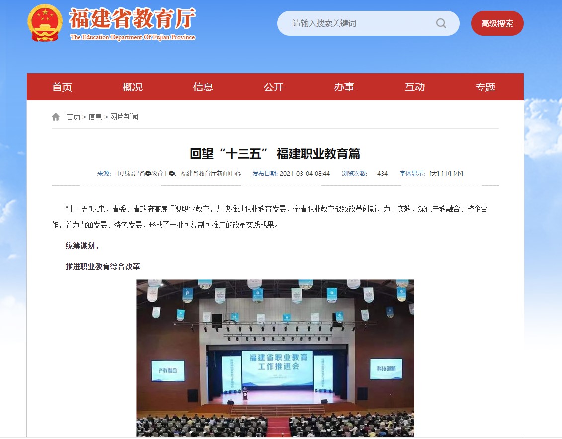 2020年5月,国务院办公厅对落实有关重大政策措施真抓实干成效明显地方予以督查激励,福建省在职业教育领域“校企合作推进力度大、职业教育发展环境好、推进职业教育改革成效明显”,成为被通报激励的4个省份之一。