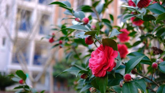 看那绽放着笑脸的山茶花,几十片心形的花瓣叠叠层层,开得芬芳馥郁,开得欢快舒畅。不惧风雨,无畏艰险。盼君归来,不负韶华。