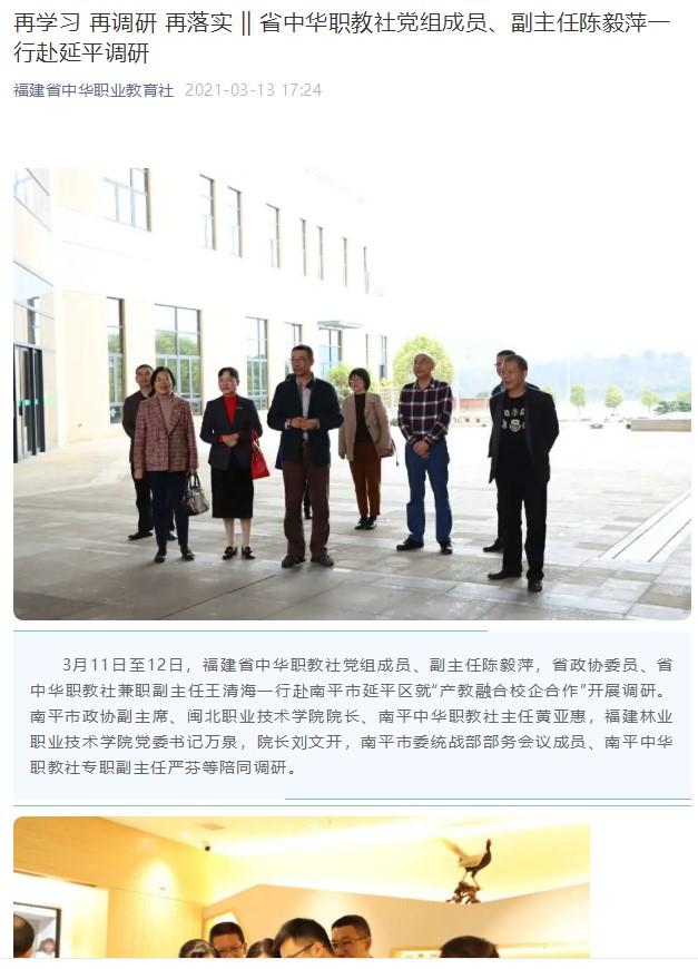 3月11日至12日,福建省中华职教社党组成员、副主任陈毅萍,省政协委员、省中华职教社兼职副主任王清海一行赴南平市延平区就“产教融合校企合作”开展调研。南平市政协副主席、闽北职业技术学院院长、南平中华职教社主任黄亚惠,福建林业职业技术学院党委书记万泉,院长刘文开,南平市委统战部部务会议成员、南平中华职教社专职副主任严芬等陪同调研。