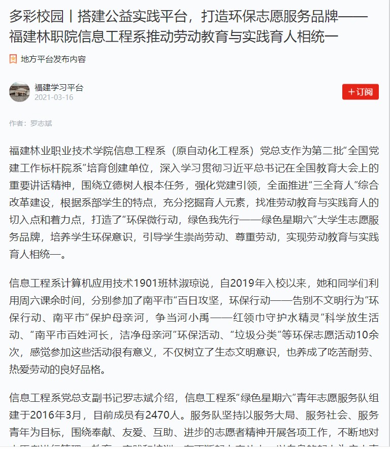 福建林业职业技术学院信息工程系(原自动化工程系)党总支作为第二批“全国党建工作标杆院系”培育创建单位,深入学习贯彻习近平总书记在全国教育大会上的重要讲话精神,围绕立德树人根本任务,强化党建引领,全面推进“三全育人”综合改革建设,根据系部学生的特点,充分挖掘育人元素,找准劳动教育与实践育人的切入点和着力点,打造了“环保微行动,绿色我先行——绿色星期六”大学生志愿服务品牌,培养学生环保意识,引导学生崇尚劳动、尊重劳动,实现劳动教育与实践育人相统—。