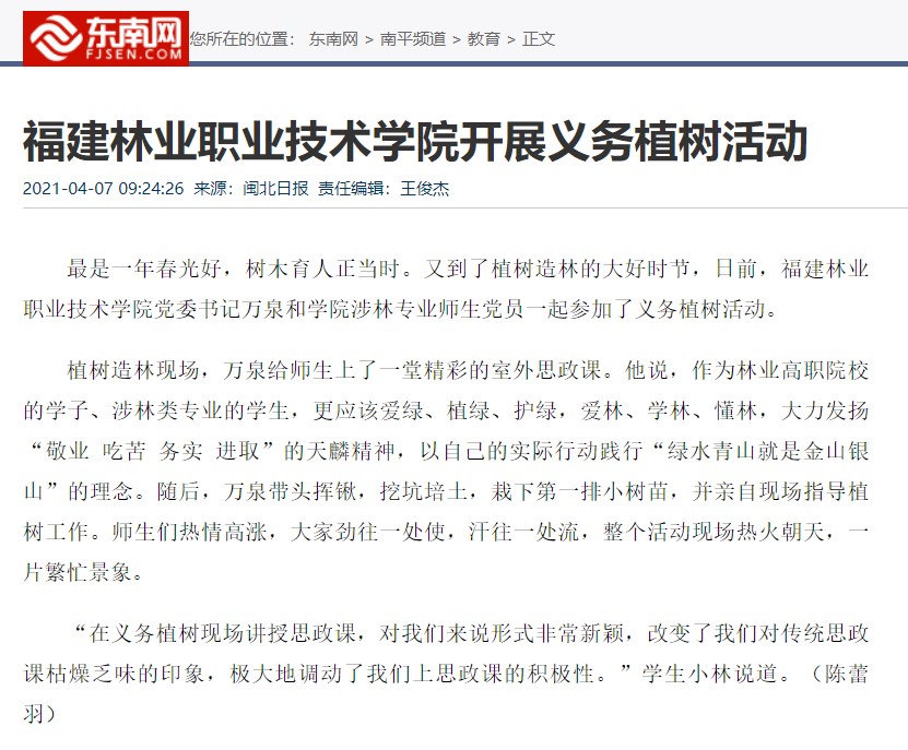 最是一年春光好,树木育人正当时。又到了植树造林的大好时节,日前,福建林业职业技术学院党委书记万泉和学院涉林专业师生党员一起参加了义务植树活动。
