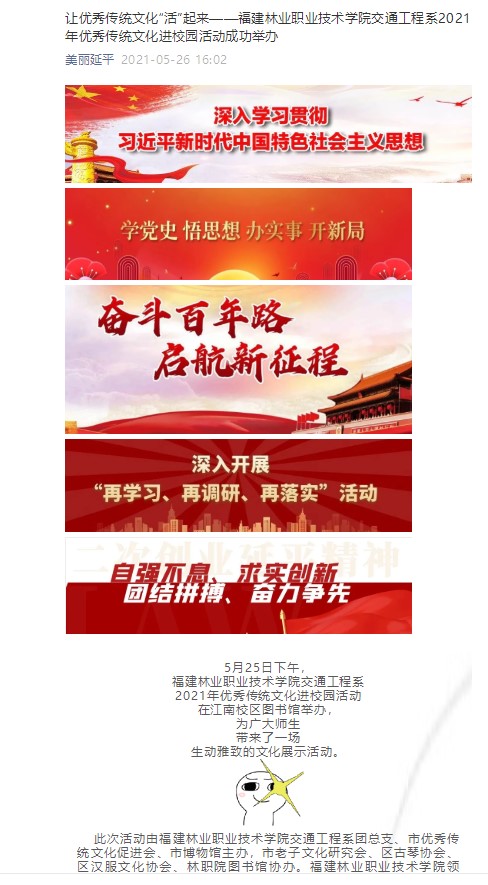 5月25日下午,福建林业职业技术学院交通工程系2021年优秀传统文化进校园活动在江南校区图书馆举办,为广大师生带来了一场生动雅致的文化展示活动。