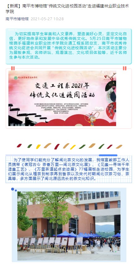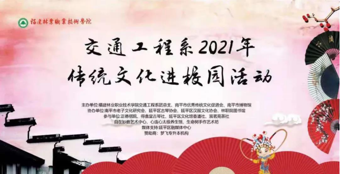 为切实提高学生审美和人文素养,塑造美好心灵,坚定文化自信,更好地传承和发展中华优秀传统文化。5月25日南平市博物馆携手福建林业职业技术学院交通工程系团总支、南平市优秀传统文化促进会共同开展 “传统文化进校园活动”,本次活动主要分为展板参观、名师讲坛、观看演出、文化项目体验等,近千名师生参与本次活动。