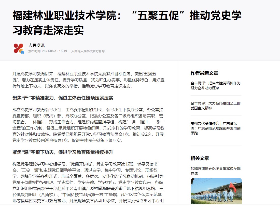 开展党史学习教育以来,福建林业职业技术学院党委紧扣目标任务,突出“五聚五促”,着力在压实主体责任、提升学习质量、我为师生办实事、彰显优势特色、用好宣传阵地上下功夫,以务实高效的举措,推动党史学习教育走深走实。