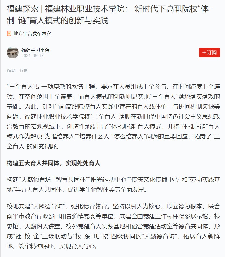 福建探索 | 福建林业职业技术学院: 新时代下高职院校“体-制-链”育人模式的创新与实践