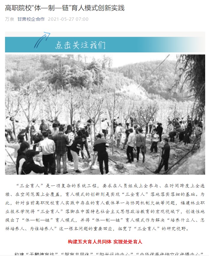 三年多来,“体—制—链”育人模式运行成效显著,学院育人质量更加契合现代林业职业教育发展需求,影响力和社会声誉显著提升,服务社会经济发展能力显著增强。学院成为福建省首批“三全育人”综合改革试点院校,获得全国党建工作标杆院系、福建省高校哲学社会科学优秀讲坛、福建省高校马克思主义理论读书社等35个国家级别和省级项目的支持,为学院“体—制—链”育人模式的研究与实践奠定了坚实基础,“‘体—制—链’育人模式的创新与实践”获2020年福建省教学成果一等奖。