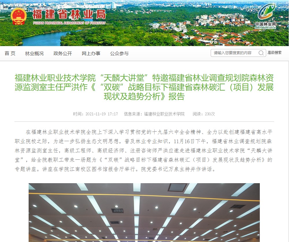 福建林业职业技术学院“天麟大讲堂”特邀福建省林业调查规划院森林资源监测室主任严洪作《“双碳”战略目标下福建省森林碳汇(项目)发展现状及趋势分析》报告