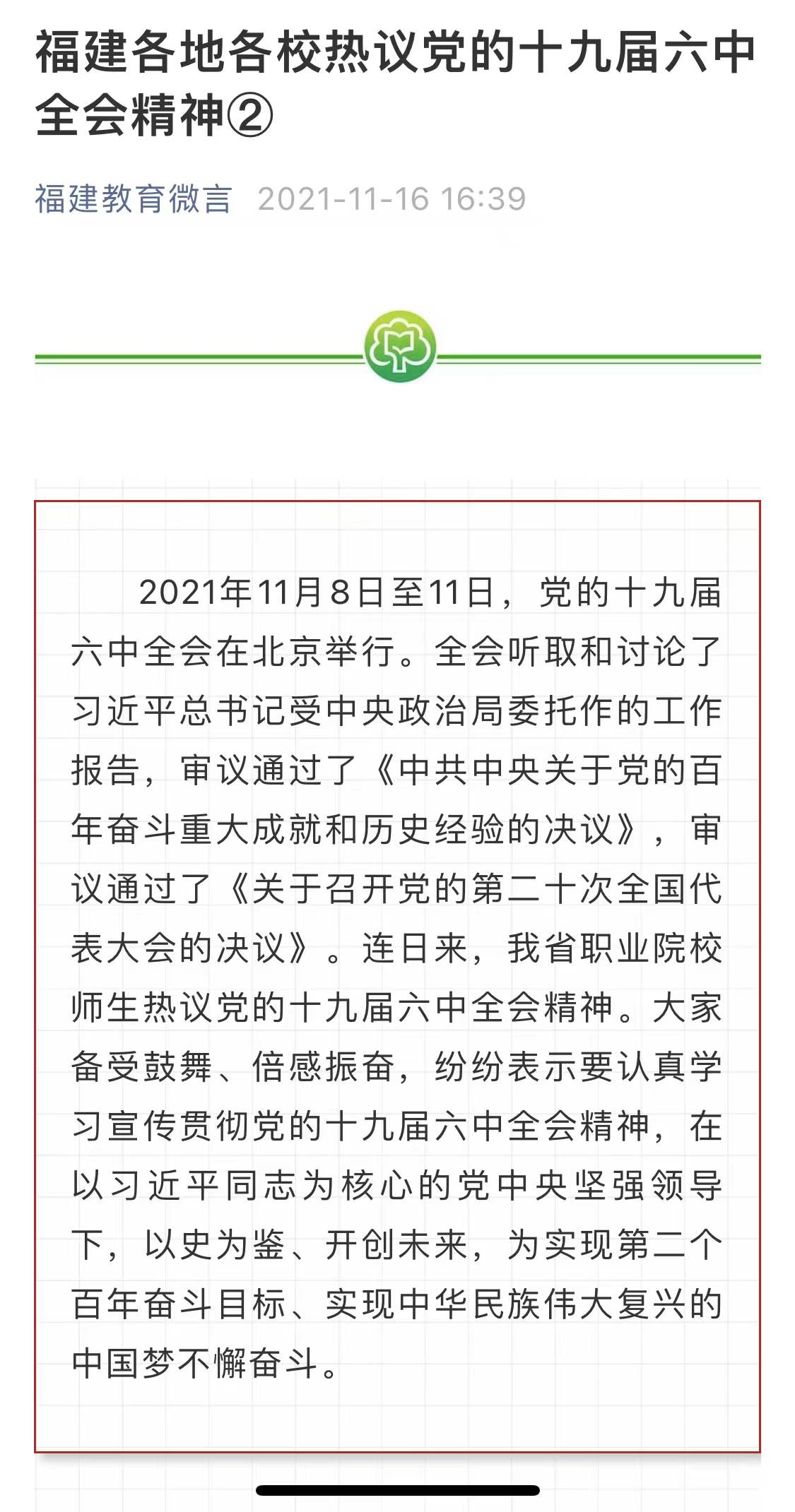 党的十九届六中全会通过的《决议》是一篇具有极强感召力和指导力的马克思主义纲领性文献,是新时代中国共产党人牢记初心使命、坚持和发展中国特色社会主义的政治宣言,是以史为鉴、开创未来、实现中华民族伟大复兴的行动指南。学院党委将深入学习贯彻全会精神,始终坚持党对教育工作的全面领导,坚定不移履行为党育人、为国育才使命,办好人民满意教育,讲好船政故事,在新时代新征程上,以更高站位、更大格局深化职教改革,主动担当起培养高素质技术技能人才、能工巧匠、大国工匠的使命,为实现第二个百年奋斗目标贡献船政职教人的力量。
