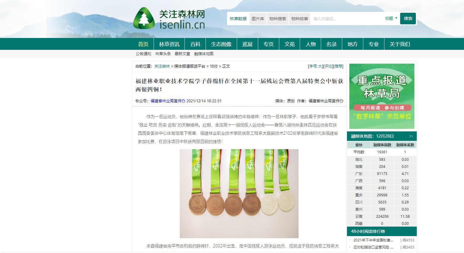 作为一名运动员,他驰骋在赛场上诠释着顽强拼搏的体育精神;作为一名林职学子,他执着于梦想书写着“敬业 吃苦 务实 进取”的天麟精神。近期,全国第十一届残疾人运动会——暨第八届特殊奥林匹克运动会在陕西西安奥体中心体育馆落下帷幕,福建林业职业技术学院信息工程系大数据技术2102班学生薛绵轩代表福建省参加比赛,在游泳项目中斩获两银四铜的佳绩!
