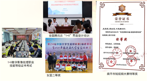 系党总支“围绕教学抓党建,抓好党建促教学”。教科研水平有了质的飞跃。2021年申报立项校级教学质量工程16项;在教师教学能力大赛中,取得省赛三等奖1项,校赛三等奖4项;在全省职业院校技能大赛中获一等奖1项、二等奖1 项、优秀奖3项。在南平市防诈骗网络视频大赛中,获特等奖1项、一等奖4项、二等奖4项、三等奖3项。加强体育工作,体育教研室承担并顺利完成了第三十三届田径运动会竞赛工作。组建了男子篮球队、女子篮球队、啦啦操队、瑜伽队等7支运动队伍。学院女篮和男篮在2021年福建省大学生篮球联赛中分别取得了二等奖和三等奖的好成绩。举办全国性腾讯云“1+X”界面设计职业技能等级证书师资培训,开展学生“1+X界面设计”“1+X实用英语交际”职业技能等级证书培训考试。首次在校内举办普通话水平测试,考试人数达1500人以上。全年技术服务收入达14.6万元。