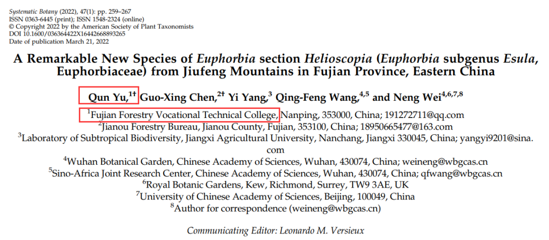 学院林学系俞群老师发现的新种“修大戟”发表在国际植物分类学权威期刊《Systematic Botany》
