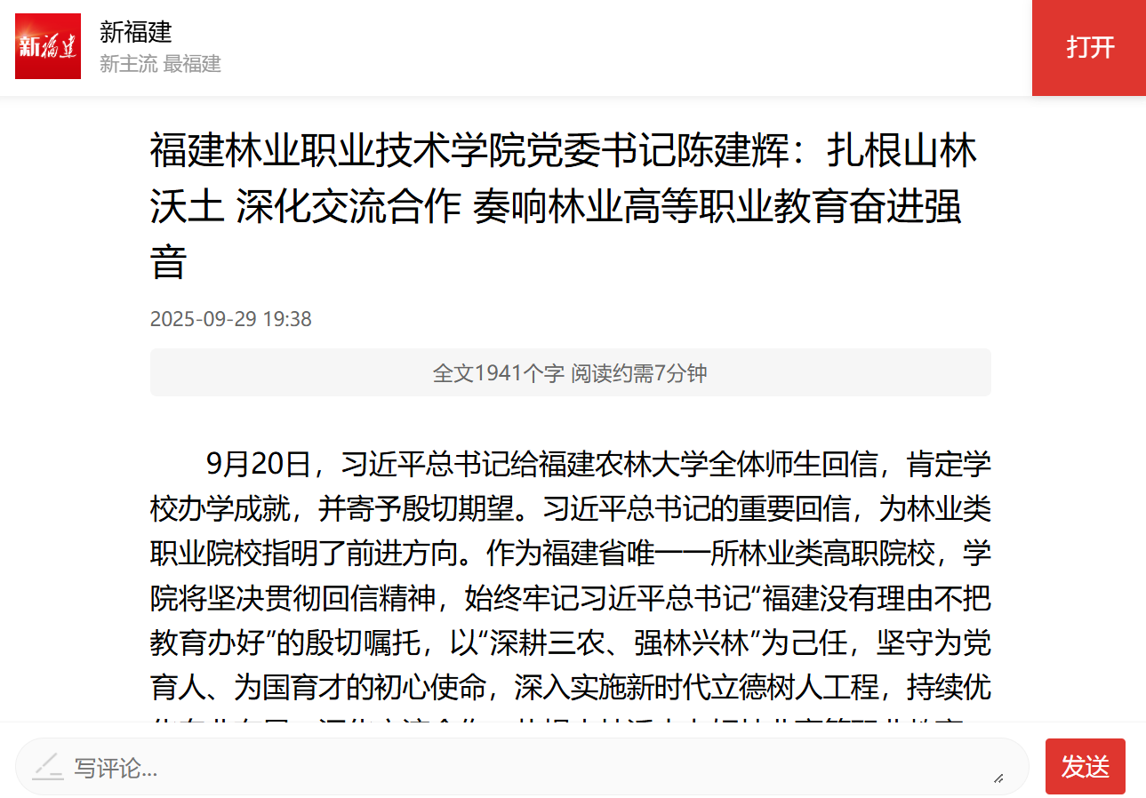 20日,习近平总书记给福建农林大学全体师生回信,肯定学校办学成就,并寄予殷切期望。习近平总书记的重要回信,为林业类职业院校指明了前进方向。作为福建省唯一一所林业类高职院校,学院将坚决贯彻回信精神,始终牢记习近平总书记“福建没有理由不把教育办好”的殷切嘱托,以“深耕三农、强林兴林”为己任,坚守为党育人、为国育才的初心使命,深入实施新时代立德树人工程,持续优化专业布局,深化交流合作,扎根山林沃土办好林业高等职业教育,为谱写中国式现代化福建篇章注入绿色动能。