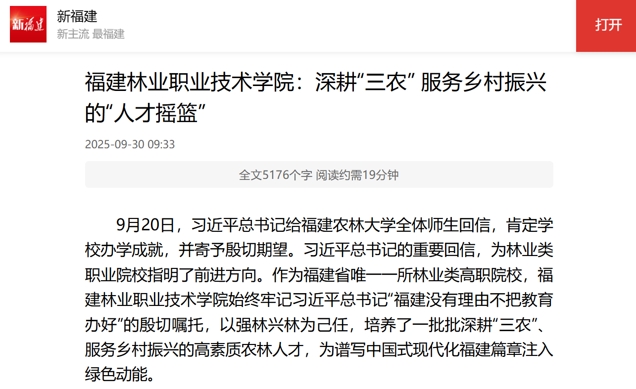9月20日,习近平总书记给福建农林大学全体师生回信,肯定学校办学成就,并寄予殷切期望。习近平总书记的重要回信,为林业类职业院校指明了前进方向。作为福建省唯一一所林业类高职院校,福建林业职业技术学院始终牢记习近平总书记“福建没有理由不把教育办好”的殷切嘱托,以强林兴林为己任,培养了一批批深耕“三农”、服务乡村振兴的高素质农林人才,为谱写中国式现代化福建篇章注入绿色动能。
