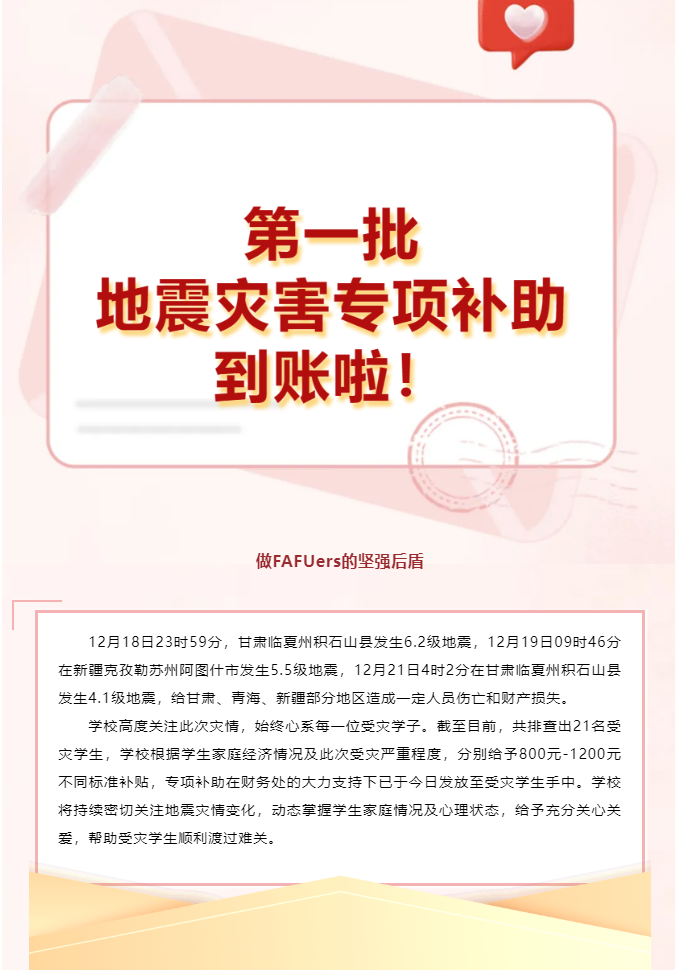 12月18日23时59分,甘肃临夏州积石山县发生6.2级地震,震源深度10千米,造成重大人员伤亡。地震无情,资助有爱。灾情发生后,我省各高校学生资助管理部门紧急行动,迅速排查家在受灾地区的本校学生,并提供紧急帮扶,确保他们安心就学。