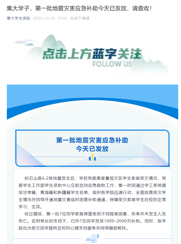 集美大学高度重视灾区学生家庭受灾情况,党委学生工作部学生资助中心立即启动应急救助工作,第一时间通过学工系统摸排甘肃籍、青海籍和新疆籍学生名单,组织各学院迅速行动、全面排查受灾学生情况并持续开通地震灾害临时困难补助通道。经过摸排,第一批7位同学家庭房屋受到不同程度损害,所幸并未发生人员伤亡。学校已向受灾学生发放1000-2000元补助。同时,各学院也为受灾同学提供及时的心理支持服务并持续跟踪帮扶。