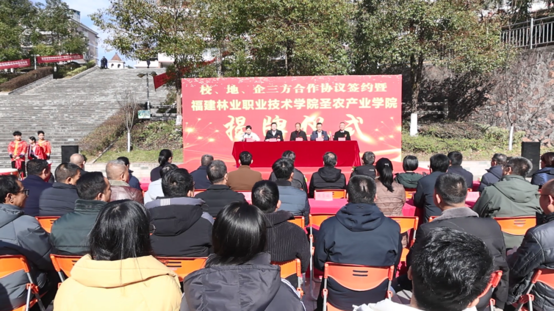 随后,三方代表现场签署了校、地、企三方共建产业学院协议。校、地、企三方领导为“福建林业职业技术学院圣农产业学院”揭牌。