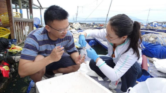厦门大学海洋与地球学院“双带头人”教师党支部书记陈仕玺作为“科技特派员”在宁德鱼排对大黄鱼进行取样。(福建省教育厅供图)