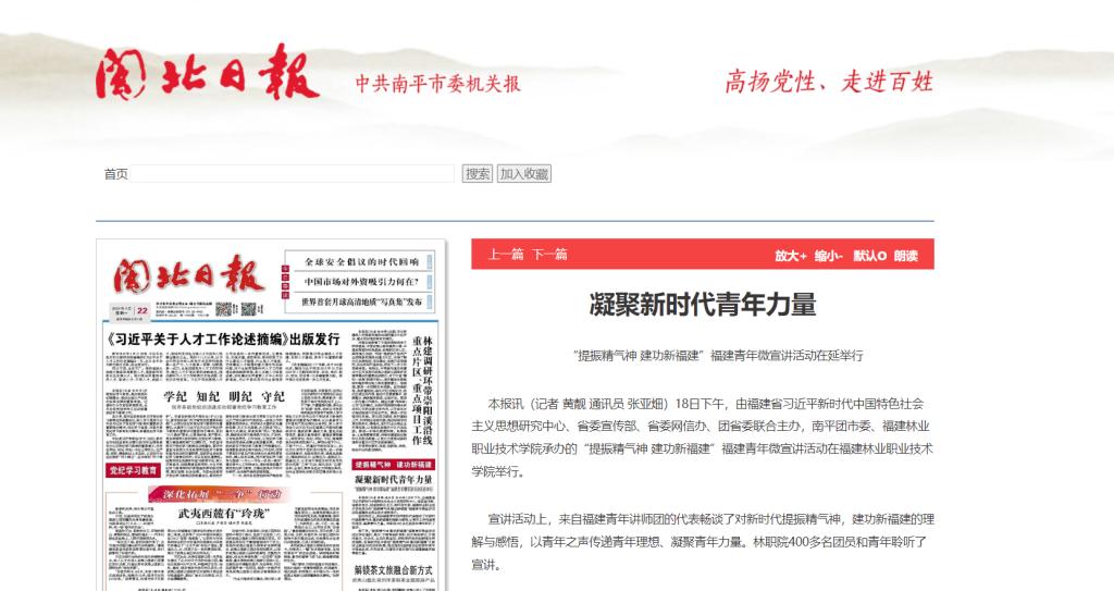 本报讯(记者 黄靓 通讯员 张亚畑)18日下午,由福建省习近平新时代中国特色社会主义思想研究中心、省委宣传部、省委网信办、团省委联合主办,南平团市委、福建林业职业技术学院承办的“提振精气神 建功新福建”福建青年微宣讲活动在福建林业职业技术学院举行。
