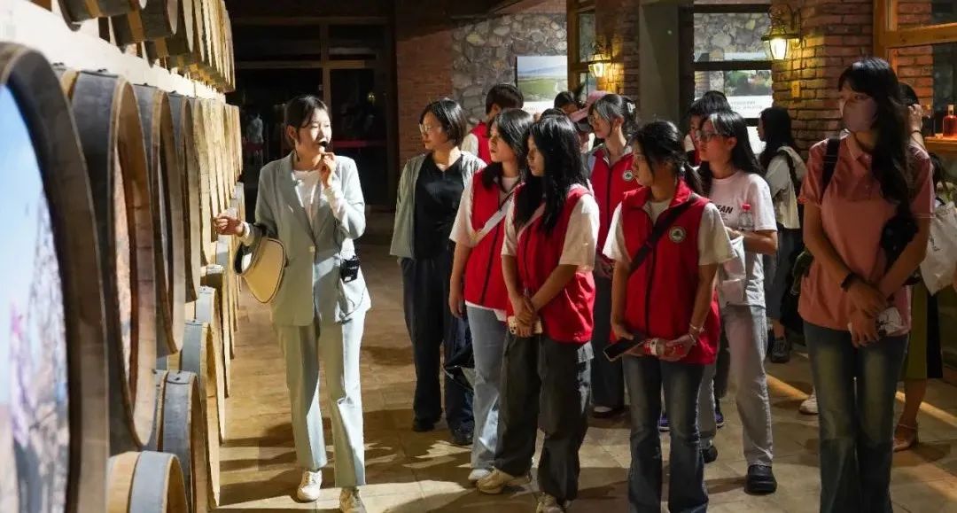 精耕细作、持续发展,擦亮宁夏“紫色名片”。实践团队先后来到银川市西夏区志辉源石酒庄、闽宁镇贺兰红酒庄参观研学,了解宁夏特色产业发展情况。伴着馥郁的葡萄酒香,队员们走进发酵车间、地下酒窖、品酒大厅等地,深入了解酒庄的基本概况、品牌成长历程、葡萄酒酿造工艺以及酒庄所获荣誉。通过实地参观、聆听介绍、亲自品尝等形式,队员们熟悉了葡萄酒从种植、采摘、筛选、破皮、榨汁、澄清、发酵、陈酿到灌装的整个生产过程,闽宁学子共话宁夏牢记总书记嘱托大力发展葡萄酒产业,用“紫色经济”助推乡村振兴的奋斗故事。