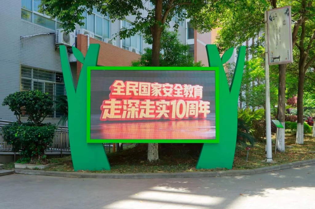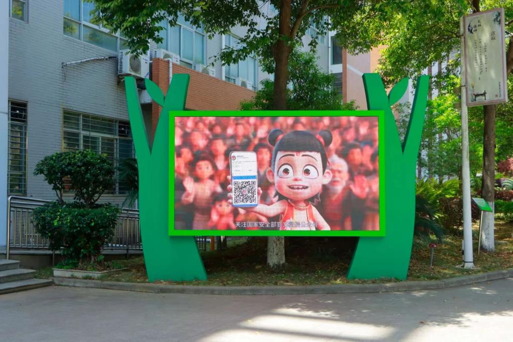 ▲在学校中心位置摆放“全民国家安全教育 走深走实十周年”主题展架
