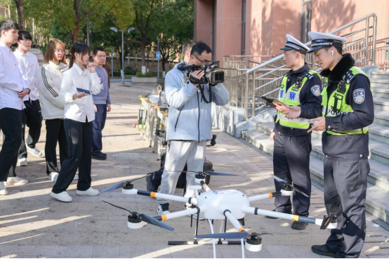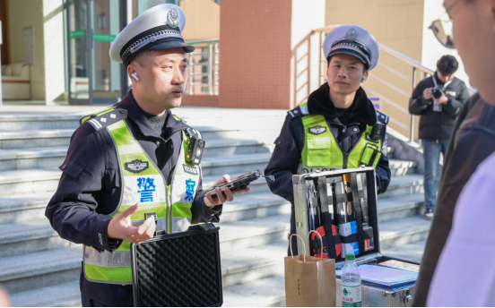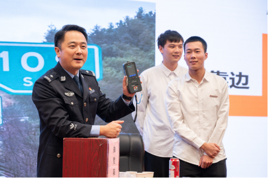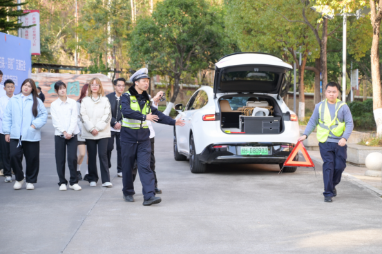 活动开始前,南平高速交警支队一大队的警官对交通安全设备进行了讲解,并现场模拟演示了在高速上发生两车碰撞交通事故时正确的处置方式,使同学们能直观地学习到正确的处置流程。