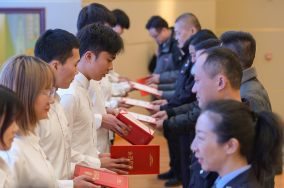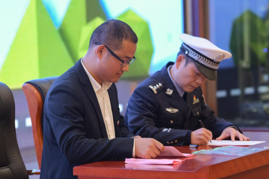 南平高速交警支队一大队大队长陈宗富与学院安全保卫处副处长杨峰代表双方签订共建协议,与会领导为我院“平安归来·高校”交通安全志愿宣讲员代表颁发荣誉证书。