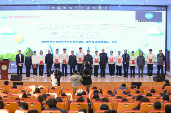 本网讯 为深入贯彻习近平总书记关于安全生产的重要指示批示精神,积极响应国家关于进一步加强高职院校学生安全教育的号召,进一步发挥高校学生作为社会新兴力量的引领作用,12月24日下午,学院安保处、团委和学工部联合南平高速交警支队共同举办“平安归来·高校”交通安全宣传日活动。学院党委副书记严绍裕,南平高速交警支队一大队大队长陈宗富、教导员黄立彬和副大队长周丽华,夏道派出所所长吴哲文,延平高铁站派出所警务队长邹青,以及学院安保处、团委和学工部负责人,各系教师和学生代表500余人参加活动。活动由安保处副处长杨峰主持。