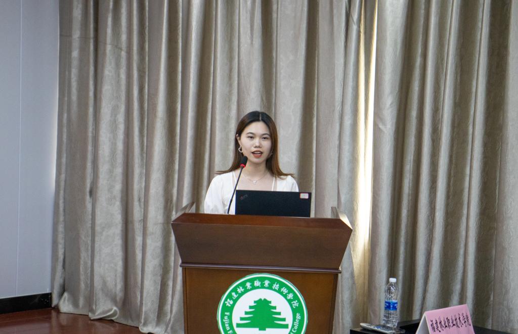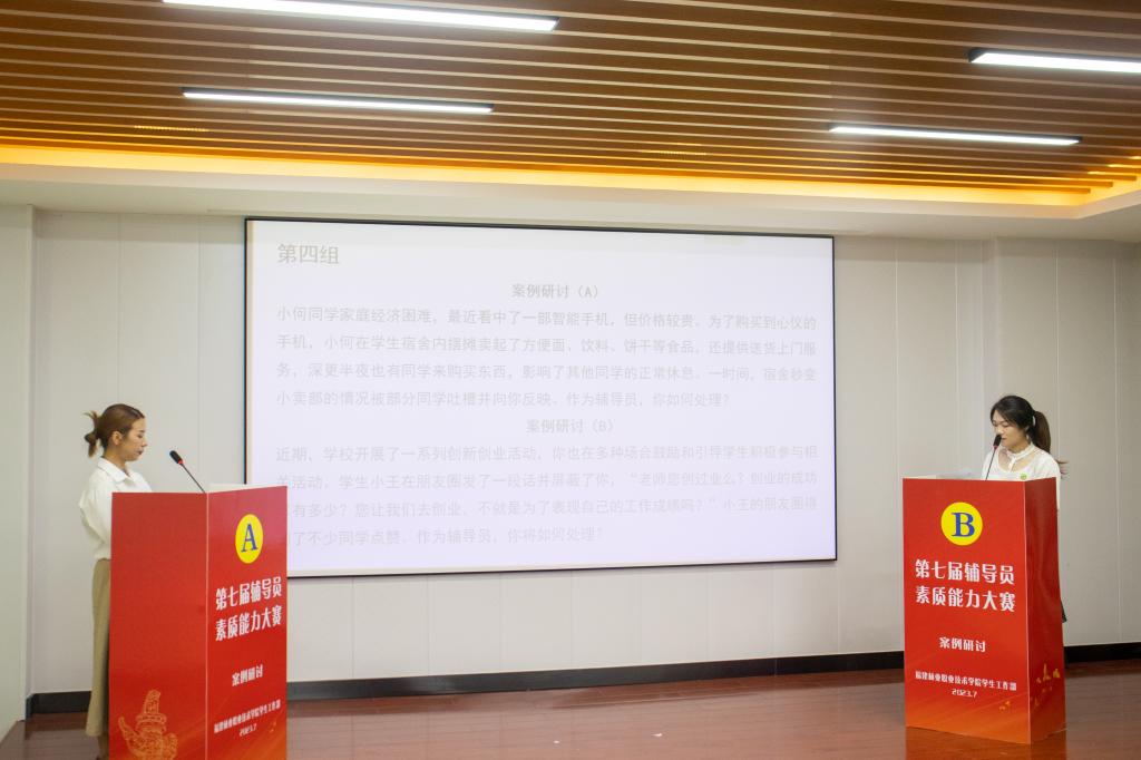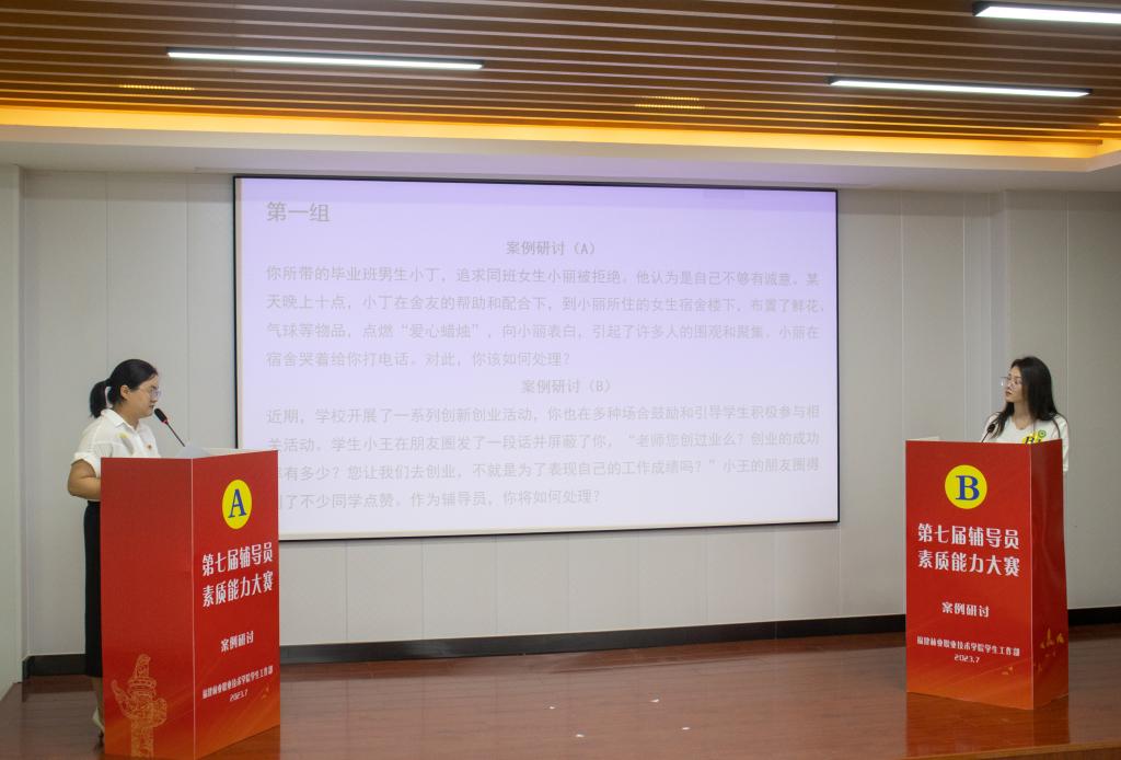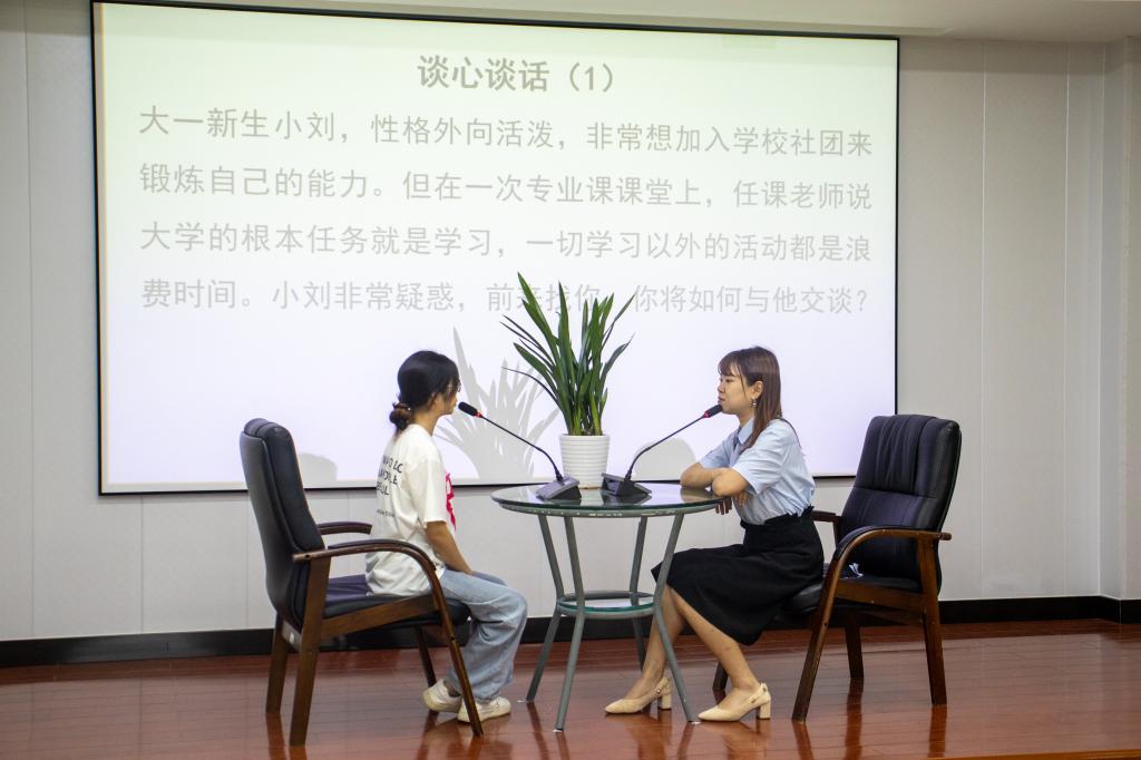 现场比赛环节在江南校区行政楼第四会议室举行。福建师范大学美术学院党委副书记乐有方,福建师范大学音乐学院党委副书记杜成煜担任比赛评委。我院学生工作部部长蔡敏、学生工作部副部长吴旻以及各系学生科长和全体专职辅导员进行了现场观摩。现场比赛由经济管理系辅导员吴艺菀主持。