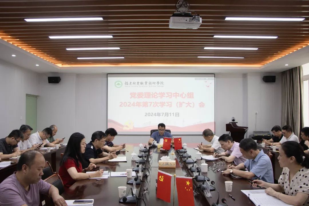 本网讯 7月11日,院党委书记陈建辉在江南校区行政楼五楼会议室主持召开2024年第7次党委理论学习中心组学习(扩大)会,传达学习习近平总书记近期重要讲话重要指示批示精神并提出贯彻意见,开展习近平总书记对福建工作的重要讲话重要指示批示精神和财经纪律专题学习。院党委理论学习中心组成员、各党总支书记、机关处室党支部书记参加学习。