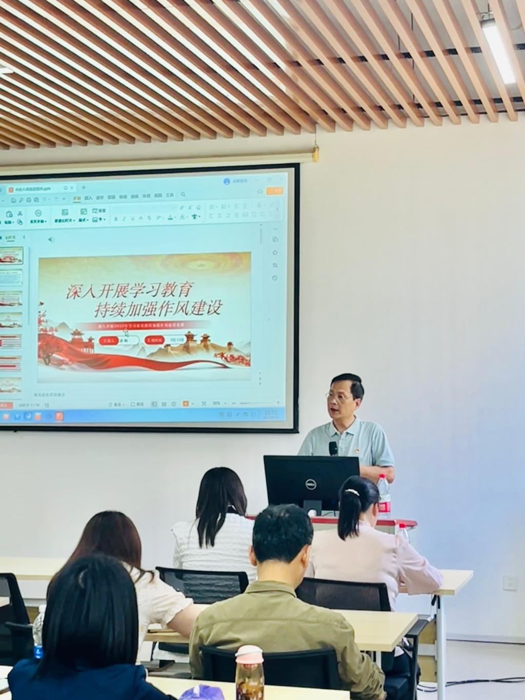 黄晖副院长以“深入开展学习教育 持续加强作风建设”为主题,围绕“提高站位,深刻认识开展学习教育的重要意义”“强化认识,准确把握落实中央八项规定精神的宝贵经验”“改进作风,持续落实中央八项规定精神”三个方面展开授课。他结合历史典故与现实案例,深入阐释了中央八项规定精神的时代内涵与实践要求。黄晖副院长指出,中央八项规定精神是新时代全面从严治党的重要抓手,其核心在于通过制度化、常态化的作风革新,架起党心与民心的连心桥。他强调,全体党员要始终站稳人民立场,以实际行动践行“从群众中来,到群众中去”的宗旨,用看得见、摸得着的成效赢得师生和群众的认可。