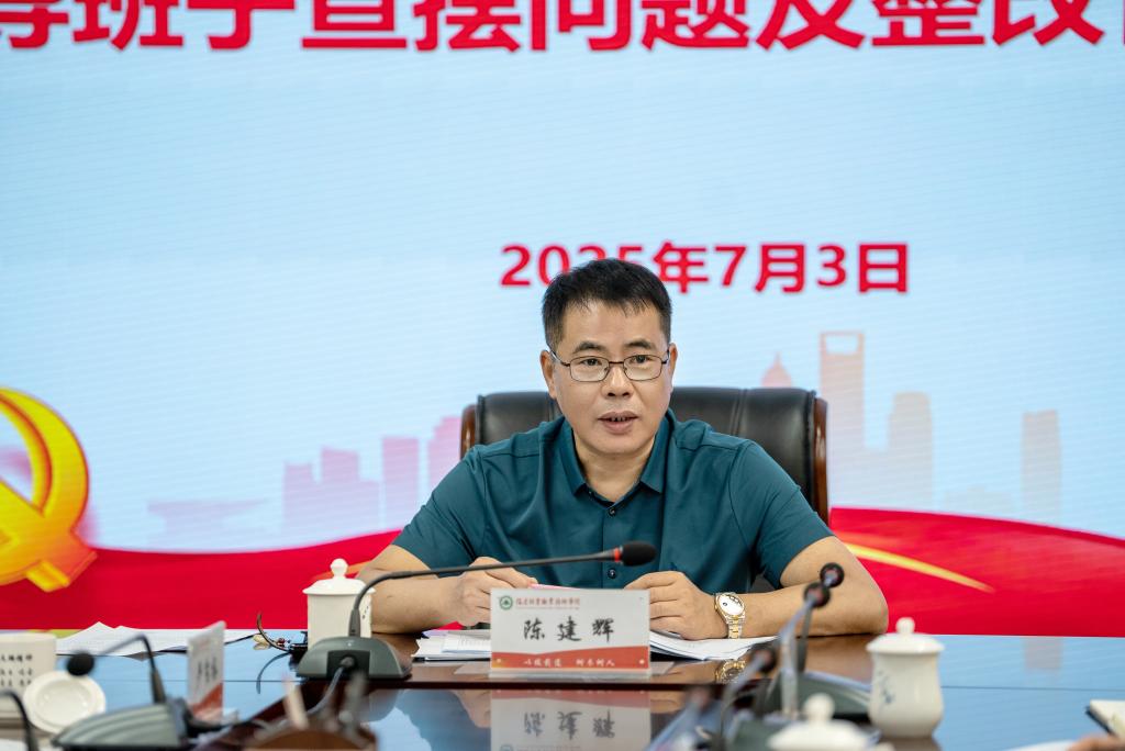 陈建辉通报了学院领导班子查摆问题及整改情况。他表示,学习教育整治整改工作开展以来,学院各部门和学习教育专班领导小组聚焦整改任务,加强组织领导,积极沟通协调,推进工作落实,取得了阶段性成效,但仍需持续发力,久久为功。
