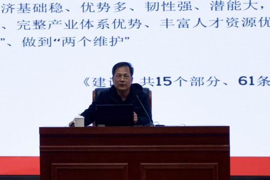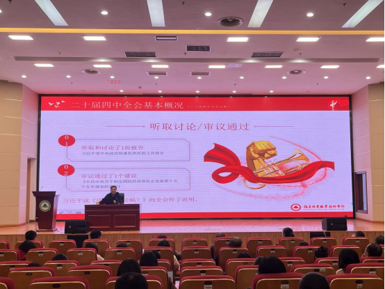 本网讯 为深入学习党的二十届四中全会精神,引导广大教职工切实把思想和行动统一到党中央的决策部署上来,深刻把握其在党和国家事业发展进程中的里程碑意义,2025年11月27日下午,学院副院长黄晖在江南校区图书馆报告厅上《党的二十届四中全会公报》专题党课。经济管理系、继续教育学院、招生就业处、现代教育技术中心及教务处全体教职工党员参加学习。本场宣讲由经济管理系副书记张翼翔主持。