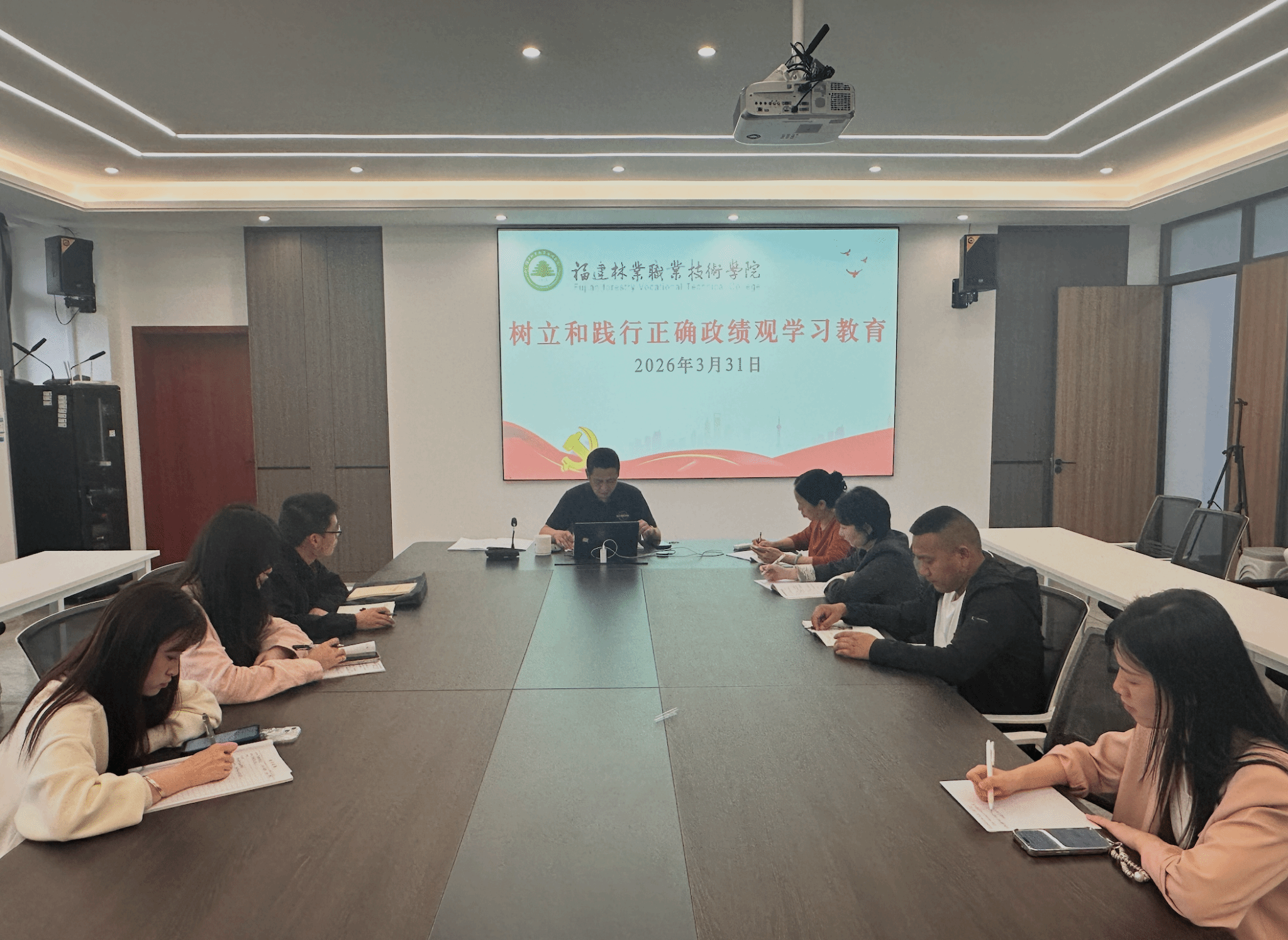 本网讯 为深入学习贯彻中共中央办公厅印发的《关于在全党开展树立和践行正确政绩观学习教育的通知》精神,进一步教育引导广大党员干部牢固树立和践行正确政绩观,2026年3月31日,艺术传媒系党总支在艺术楼401会议室组织召开树立和践行正确政绩观学习教育会议。艺术传媒系党总支书记范有福主持会议,全体教工党员参加会议。