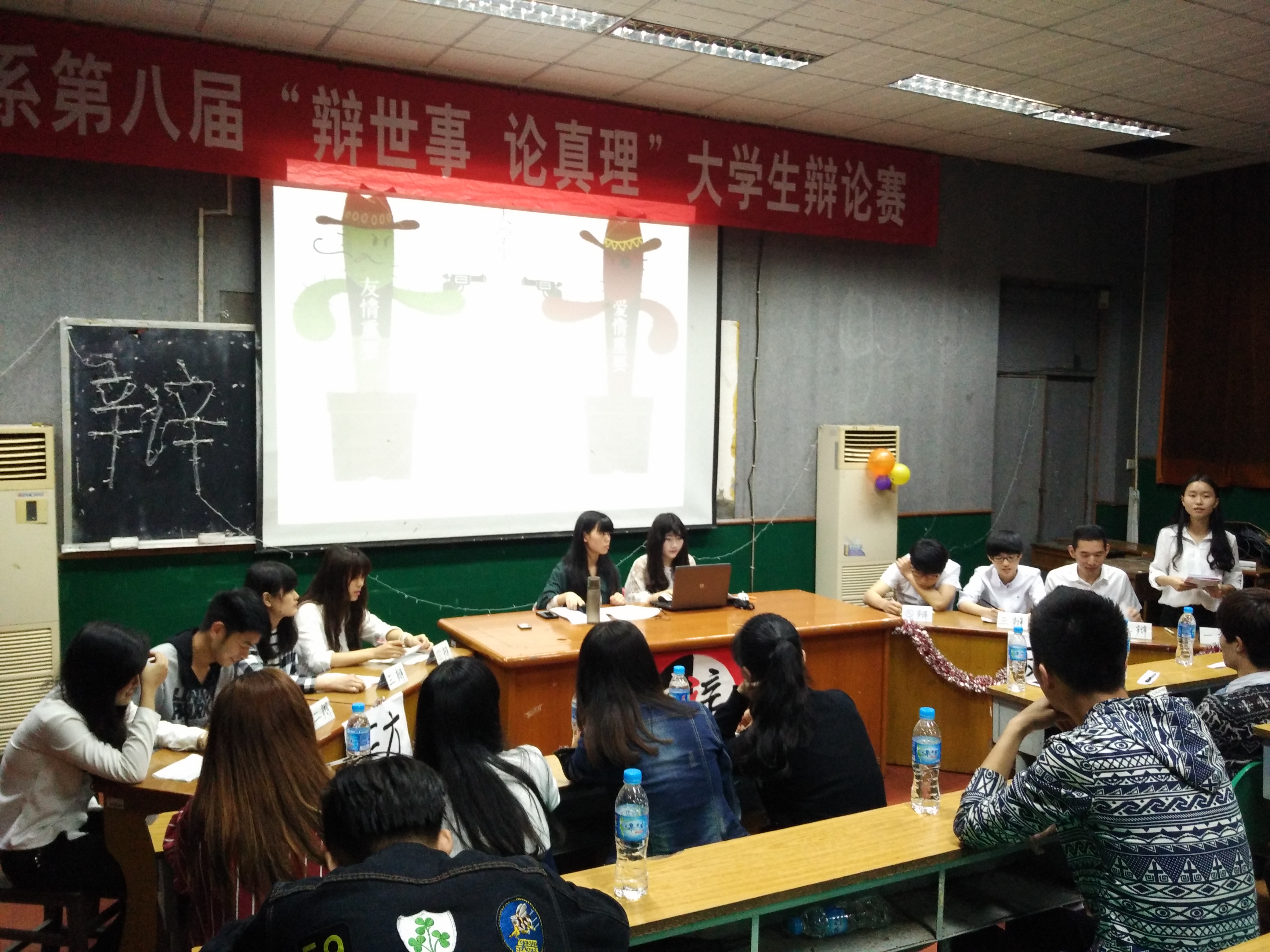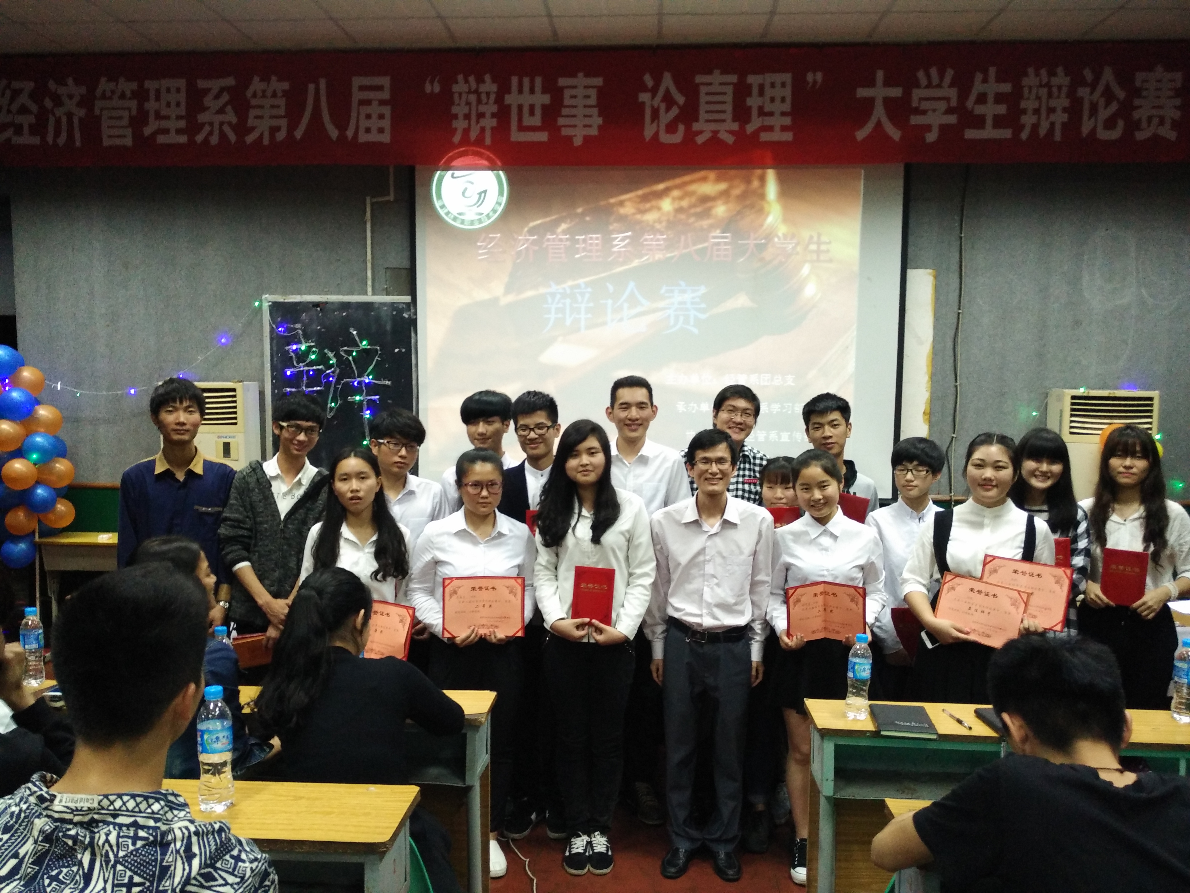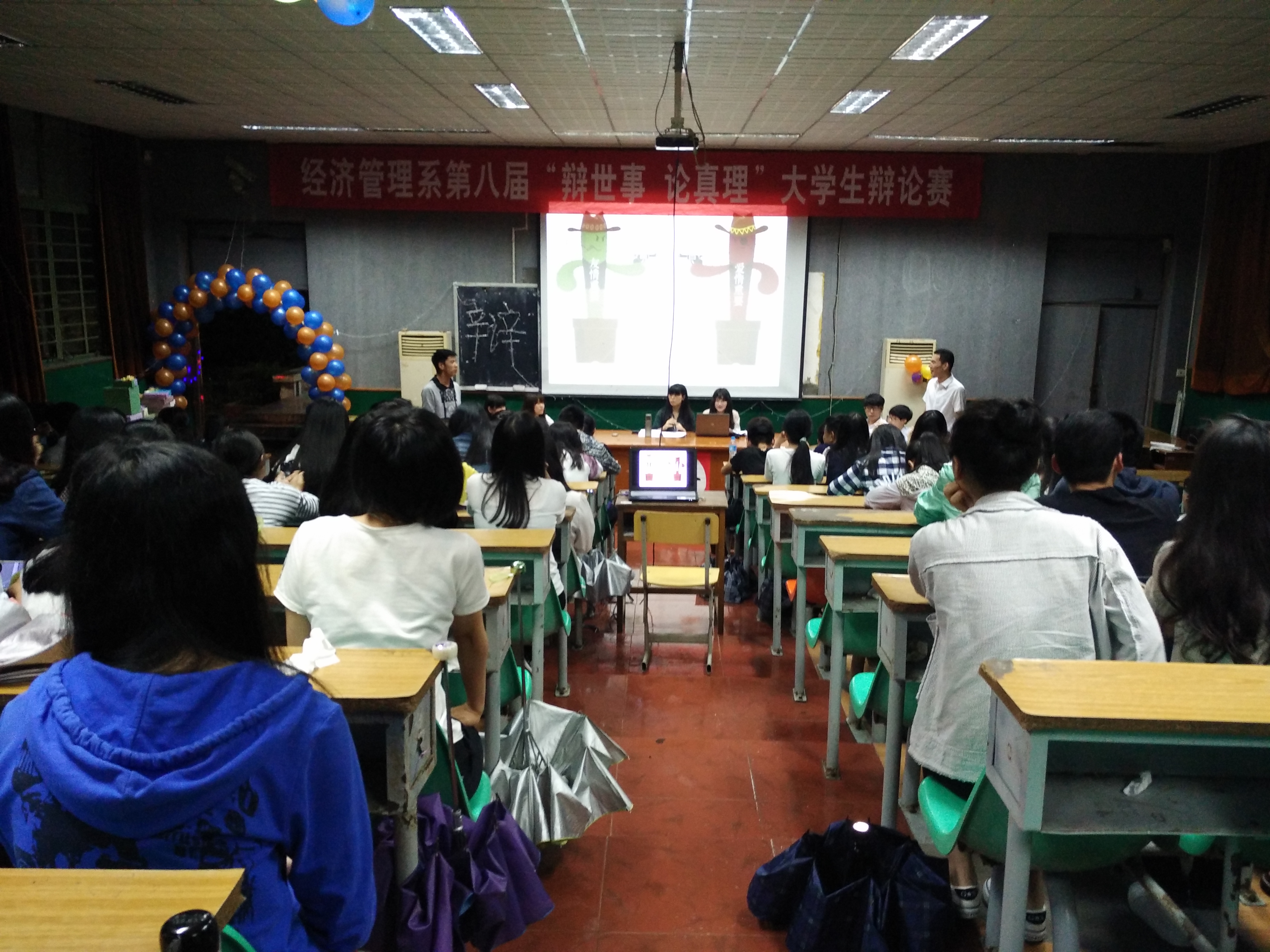2016年4月14日,经济管理系第八届“辩世事,论真理”校园辩论赛在天麟校区第一多媒体教室如期举办。经过一个月初赛、复赛的激烈角逐后,共有4队组合脱颖而出,进入辩论赛决赛。本次辩论赛旨在加强学风建设,促进各班学风交流,丰富同学课余生活,活跃校园气氛,开拓同学思路,体现大学生风华正茂的精神状态。