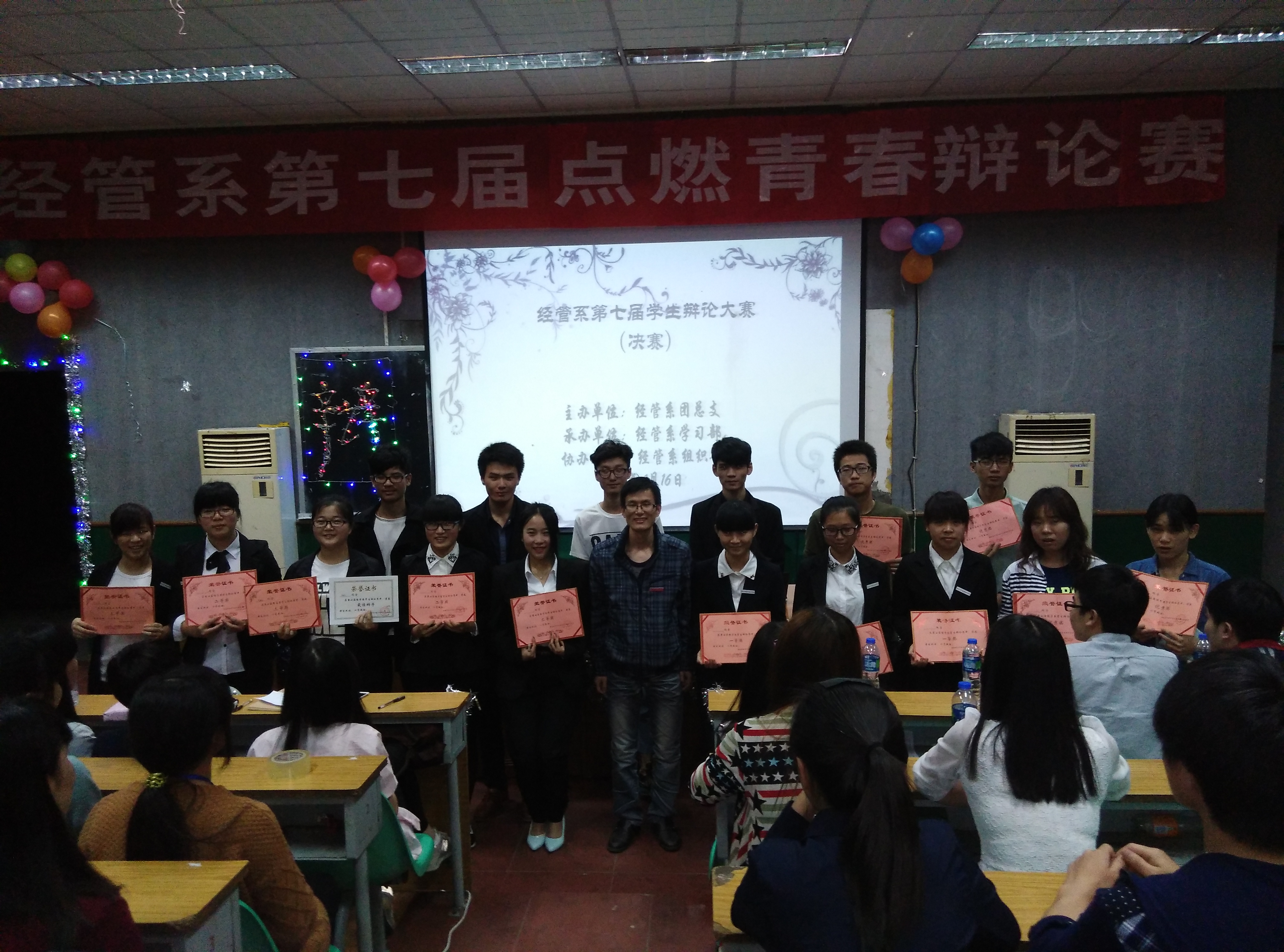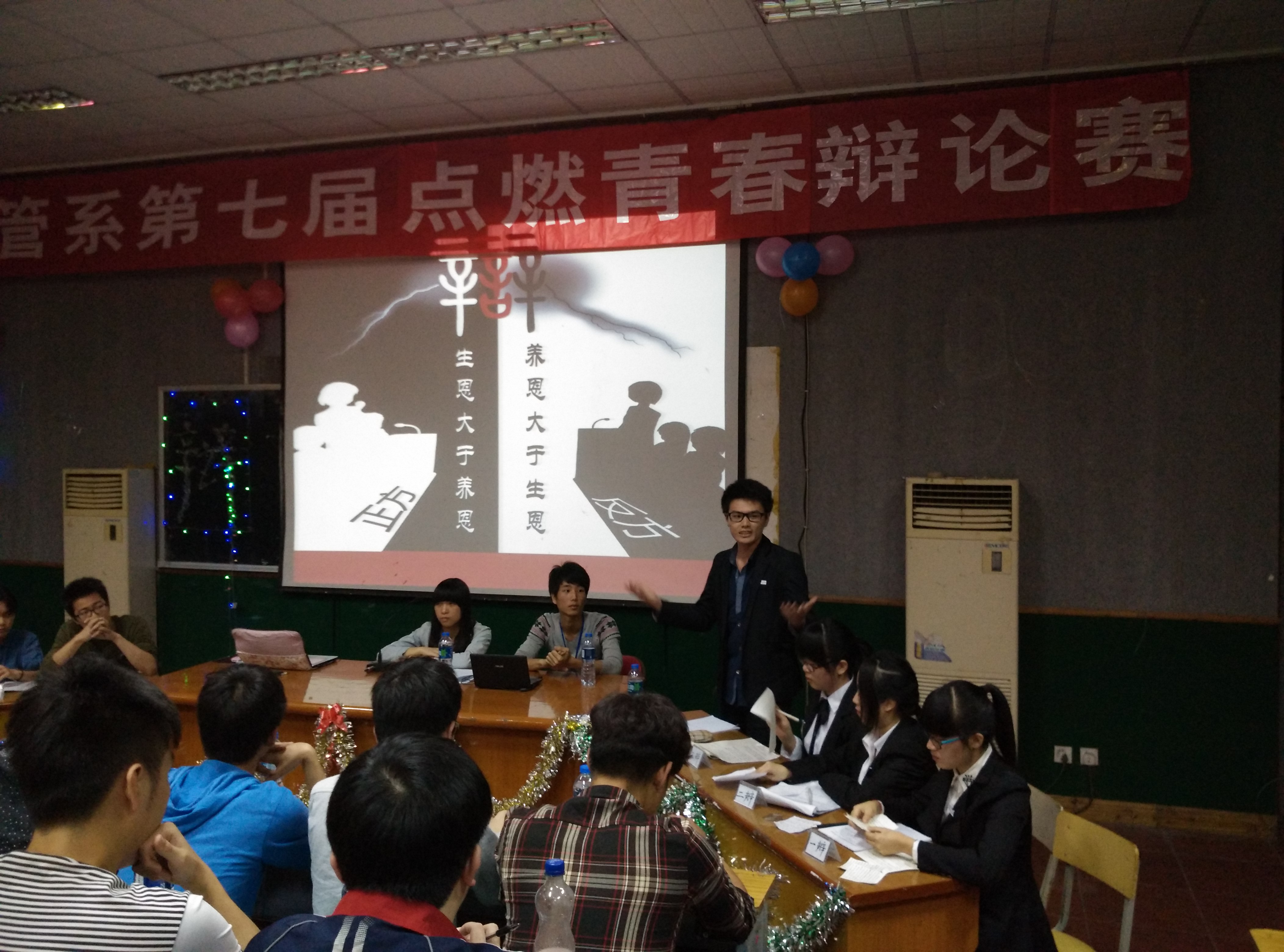 2015年4月16日,经济管理系第七届“唇枪舌剑,点燃青春”校园辩论赛在天麟校区第一多媒体教室举办。经过一个月初赛、复赛的激烈角逐后,共有4队组合脱颖而出,进入辩论赛决赛。本次辩论赛旨在加强学风建设,促进各班学风交流,丰富同学课余生活,活跃校园气氛,开拓同学思路,体现大学生风华正茂的精神状态。