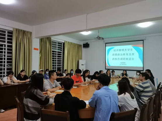 2021年5月7日晚19:30,经济管理系于经管楼408会议室召开学生意识形态谈判会议。会议由谢福荣书记主持,学生科科长王昉老师、辅导员欧阳昭勇老师、张翼翔老师出席会议,19级各班班长、团支书参会。会议分三个阶段,第一阶段为学生党员发展工作调研;第二阶段为学生思想政治教育及意识形态调研;第三阶段为2022届毕业生就业工作座谈会。
