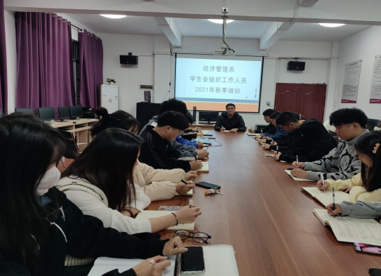 为提高学生自我教育、自我管理水平,进一步发挥学生会干部的带头作用,2021年11月,经济管理系开展了学生会组织工作人员2021年秋季培训,经济管理系学生会主席团以及全体工作人员参加培训。