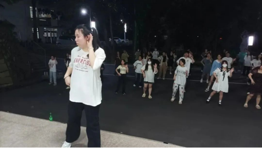 灯光通透,草长虫鸣,开阔的经管楼前,音乐悠扬,气氛欢腾。节奏铿锵的《日不落》、活力四射的《喜羊羊》等歌曲在耳边萦绕,跳广场舞的学子们在领舞同学的带领下挥舞身姿,随着音乐的鼓点变换队形。现场击掌声、呐喊声不绝于耳,吸引了众多同学的围观,大家随着音乐情不自禁地摇摆,身心得到了放松。