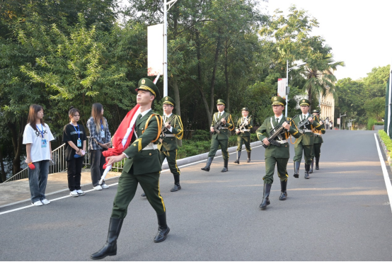在全体师生的注目下,国旗护卫队迈着整齐的步伐,护送国旗庄严地走向升旗台。随着雄壮豪迈的国歌响起,五星红旗冉冉升起,迎风飘扬,全体师生行注目礼,齐唱国歌。