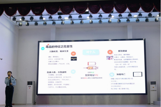 讲座过程中,陈舒悦警官向师生们介绍了毒品的种类以及对人体的危害,利用生活中鲜活的案例、短视频以及相关的法律知识向师生们进行相关毒品知识科普,使师生们认识到生活中可能存在的与毒品相关的危险情境,让师生们清楚认识毒品对个人、对家庭、对社会造成的严重性危害,增强广大师生抵制毒品的意识。最后,陈舒悦警官向师生们传递正确的观念做法,即正确对待压力、选择健康生活、结交正能量的良友,从而提高自身防毒拒毒意识。