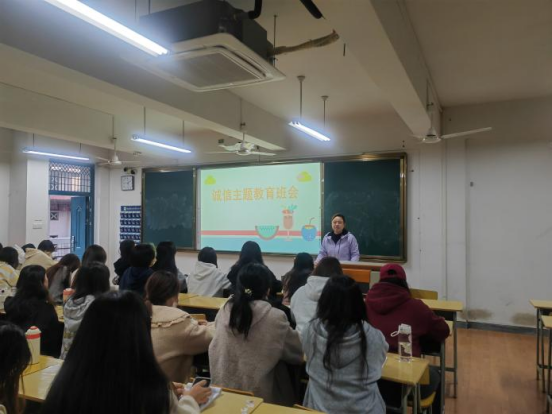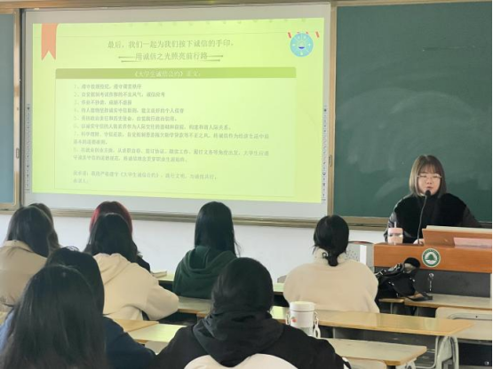经济管理系各班级开展诚信教育主题班会,各辅导员在班会中强调,作为大学生在学习上需要端正学习态度,不迟到、不早退、不旷课,独立完成自己的作业,不窃取他人的成果;在考试中遵守考场纪律,自觉抵制作弊等违纪行为;在平时与同学交往过程中,有借有还,自觉抵制小偷小摸行为。