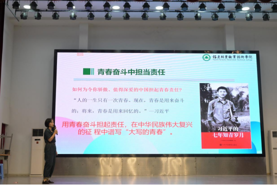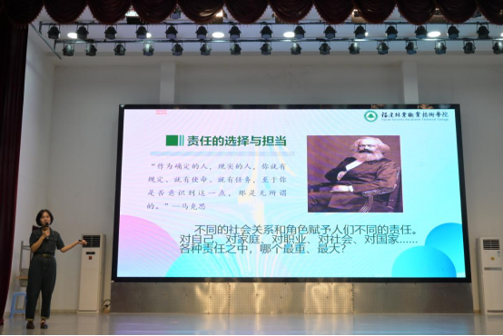 理想信念教育,为新生点亮前行灯塔。郑恩莉老师从不久前落下帷幕的巴黎奥运会说起,在那场全球瞩目的体育盛会上,众多新生代运动员以他们独有的光彩,照亮了赛场,从92年前23岁的刘长春孤身一人代表中国第一次参加奥运会,到今天中国代表团获得奥运会金牌数已经累计超过300枚。郑恩莉老师还为我们介绍了全红婵、潘展乐、郑钦文等运动员,用他们的事迹鼓励我们,他们努力的汗水也照进了我们的心田。他们的身影,是青春的剪影,他们的事迹,是奋斗的篇章。作为新时代的青年,我们要树立正确的价值观,积极传播正能量,为塑造风清气正的社会环境贡献自己的一份力量。