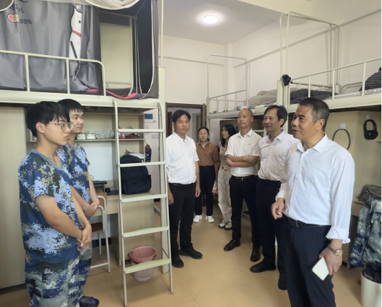 随后,陈建辉一行来到学生宿舍与同学们亲切交流,了询问学生们是否适应军训生活和宿舍生活。陈建辉书记勉励同学们在校园里要做好规划,遇到困难时要积极寻求帮助,在日常生活中要强化安全意识,共同努力营造一个安全、和谐的学习生活环境。