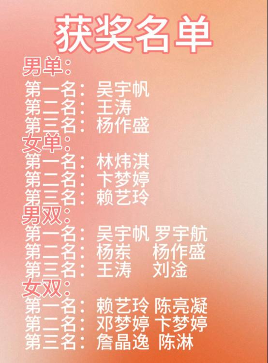 时间过得很快,在最后欢快的喝彩声中,赛场上的每位选手精神抖擞的面貌,为荣誉而战的身影都在心中被牢记。获奖名单如下