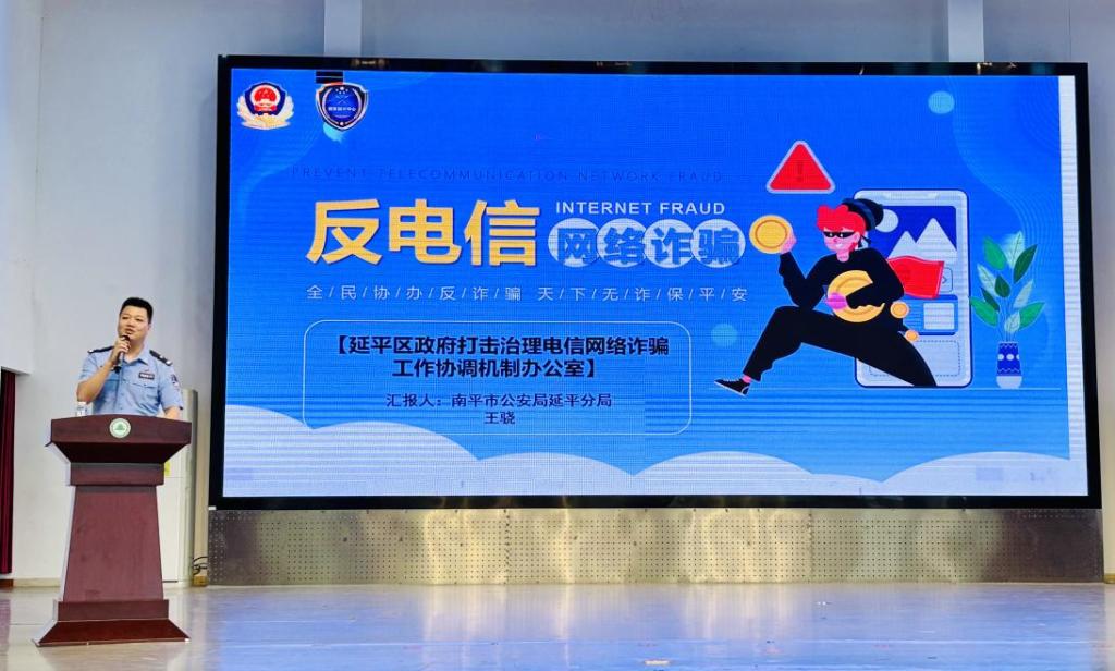为加大校园反电信网络诈骗宣传力度,提高学生防诈、识诈、反诈意识,预防各类电信网络诈骗事件发生,维护校园安全稳定,经济管理系于2025年5月20日在天麟礼堂开展“反电信网络诈骗”专题讲座。本次讲座特邀南平市公安局延平分局王骁警官主讲,由经济管理系党总支书记陈剑勇主持,延平区梅山派出所、梅山街道金山塔社区等相关工作人员、经济管理系学生科兼团总支负责人胡斌及300名学生代表参加本次活动。