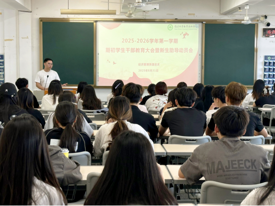 为明确学生干部职责使命,筑牢新学期工作根基,同时统筹推进新生入学助导工作,2025年8月31日,经济管理系在天麟校区科教楼602召开2025-2026学年第一学期期初学生干部教育大会暨新生助导动员会。新生辅导员、全体学生干部及新生助导参加会议,会议由经济管理系学生科兼团总支负责人胡斌老师主持。