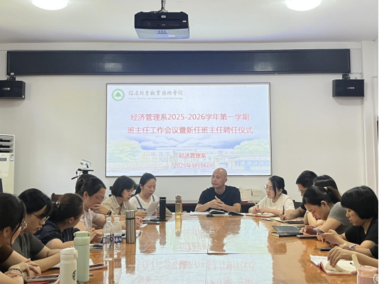 为全面部署新学期学生工作,凝聚育人合力,推动班级管理高质量发展,2025年9月16日下午,经济管理系召开2025-2026学年第一学期班主任工作会议暨新任班主任聘任仪式。经济管理系党总支书记陈剑勇、副书记张翼翔、学生科兼团总支负责人胡斌、系部全体专职辅导员与班主任参加会议。围绕落实“立德树人根本任务”,全面总结上一学期班主任工作成效,共谋新学期育人新举措。本次会议由胡斌老师主持。