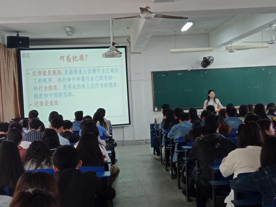 汪秀霞老师先是为我们解释了何为纪律,纪律就是规则,是指要求人们遵守业已确定的秩序、执行命令和履行自己职责的行为规范,是用来约束人们行为的规章、制度和守则的总称。纪律是党员不可触碰的“高压线”,也是政党不断壮大的“生命线”。汪老师先用处决勇冠三军的“革命功臣”黄克功的案例为我们说明了纪律的重要性,同时也引出了今天会议最主要的三点:一、全面加强党的纪律建设的历程。二、党的纪律建设取得的成效及面临的挑战。三、如何做遵守纪律的模范好学生。汪老师通过运用一系列数据和对案例的分析,使得大家充分认识到了纪律对于政党的重要性。