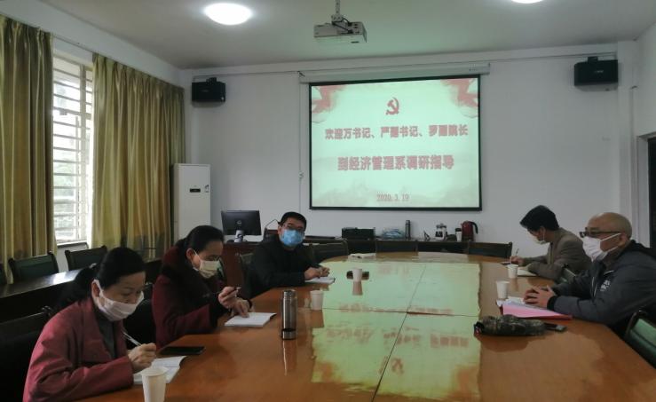 2020年3月19日下午,学院万泉书记、严绍裕副书记、罗立仪副院长等领导一行深入经济管理系进行调研指导工作。经济管理系系主任蔡敏、系党总支书记谢福荣、系副主任林文胜等及系副科级以上干部、系各党支部书记、专职辅导员陪同此次调研指导工作。
